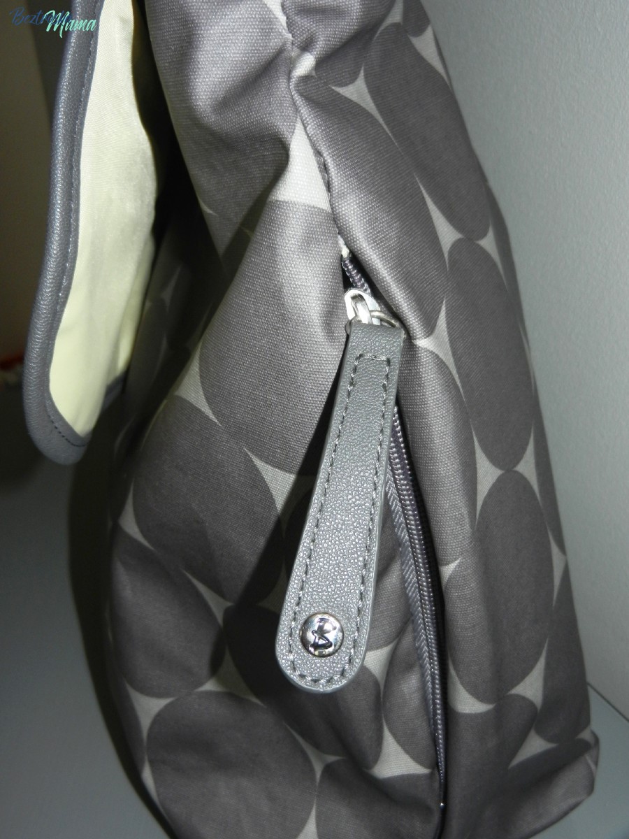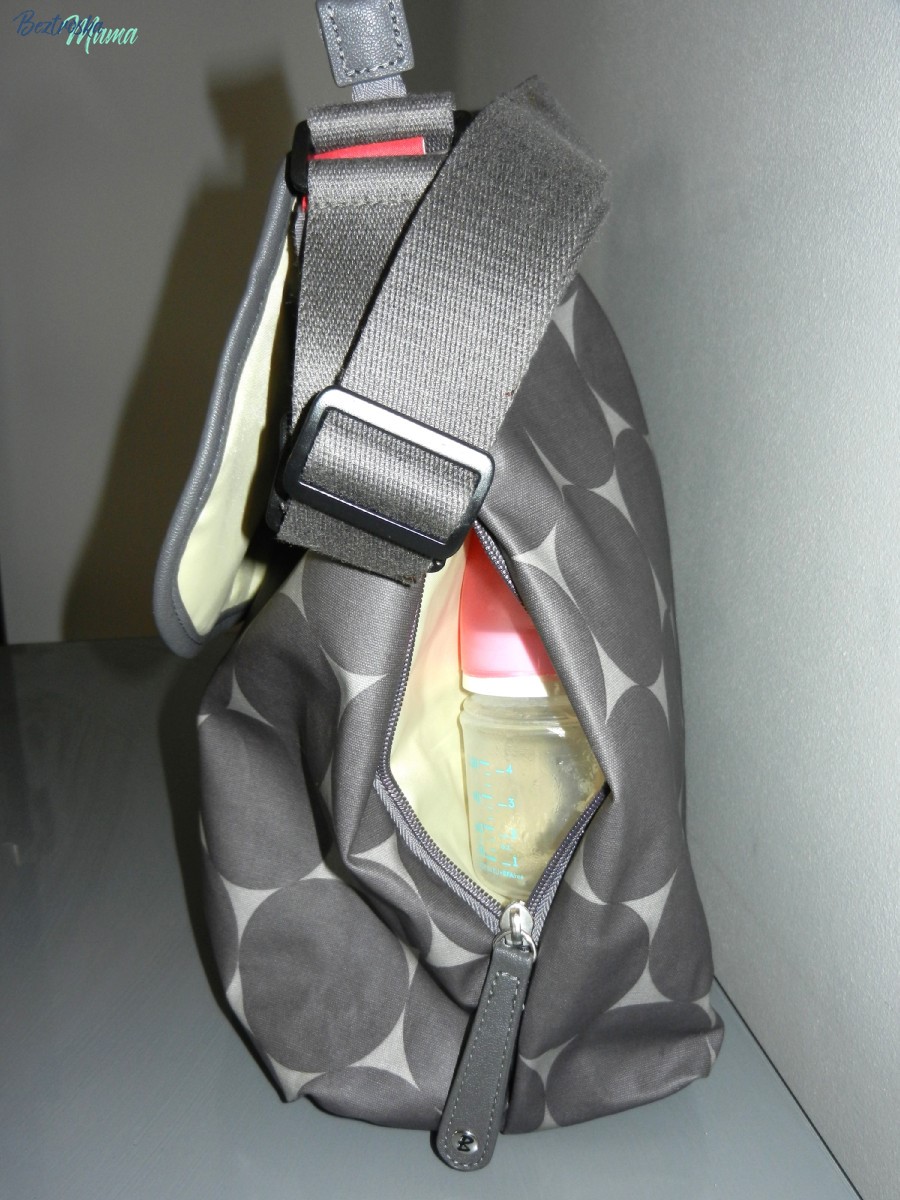 Kolejny plus dla torby to ukryta boczna kieszeń na suwak. Jest ona oznakowana metką z napisem „Insulated for bottles” i dołączonym skrawkiem materiału z którego jest wykonana. Jest to kieszeń odpowiednio izolowana aby utrzymywać ciepły pokarm (bądź zimną latte). Idealne miejsce na butelkę z smoczkiem. Ja zmieściłam bez problemu w środku butelkę 150 ml. Dzięki temu butelkę z piciem mamy zawsze pod ręką i nie musimy jej szukać w czeluściach torby.